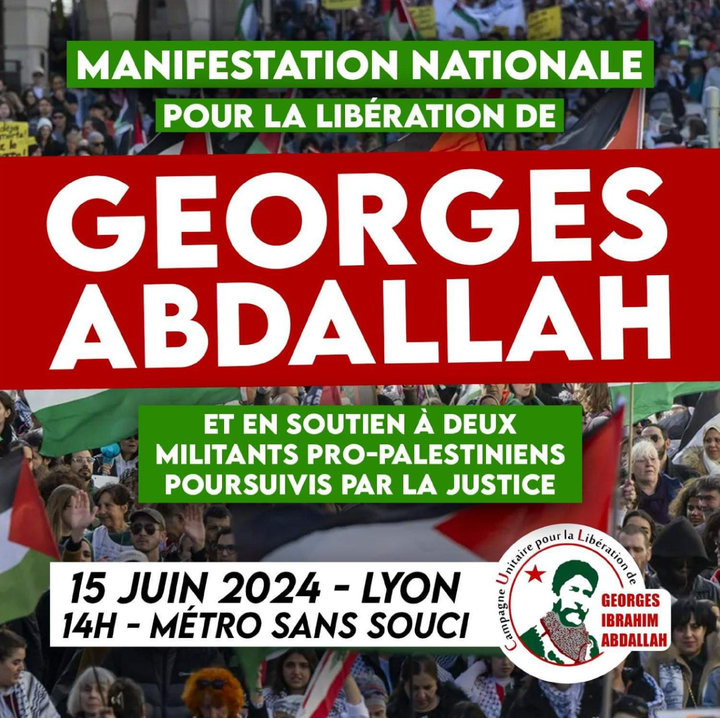 More than 3,000 participants turned out on Saturday, June 15, 2024, in Lyon to support the heroic resistance of the Palestinian people, Georges Abdallah, and two LJR comrades who will be tried tomorrow, June 18, for their support of Palestine and our comrade Georges Abdallah.