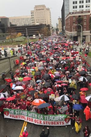Jan. 14 — Today, some 27,000 members and supporters of United Teachers Los Angeles (UTLA) picketed school sites on the rainy first morning of the Los Angeles teachers’ strike, then gathered for a huge rally at Grand Park downtown.