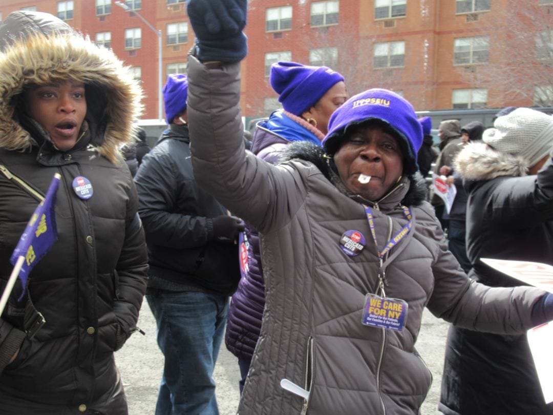 Fiery speakers from 1199SEIU, the New York State Nurses Association and community supporters warmed up this crowd of self-sacrificing workers, who care for patients and their families. With a long history of struggle by and for mostly people of color, in this community with a large West Indian population, 1199SEIU members are prepared to struggle.