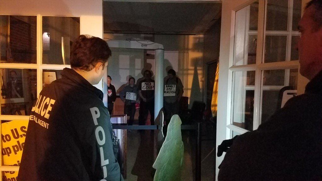 “In a remarkable turn of events, however, instead of arresting the collective members who remained inside, the D.C. police engaged in a lengthy discussion with the Embassy Protection Collective and their lawyer Mara Verheyden-Hilliard. The discussion focused on the reason that collective members were in the embassy in the first place — trying to stop the Trump administration from violating the 1961 Vienna Convention on Diplomatic Relations and the 1963 Vienna Convention on Consular Facilities by turning over the diplomatic premises to a coup government.