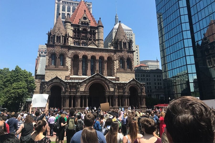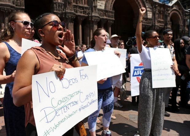 Carrying homemade signs that read, “A cage is not a home” and “We won’t be complicit in childhood incarceration,” workers marched to nearby Copley Square. Several thousand union and nonunion supporters greeted them, including UNITE/HERE Local 26, Movimiento Cosecha, Uber Guild drivers, the Boston Teachers Union’s immigrant rights action committee, Mijente, Pride at Work, 32BJ SEIU and Harvard Graduate Student Union-UAW.