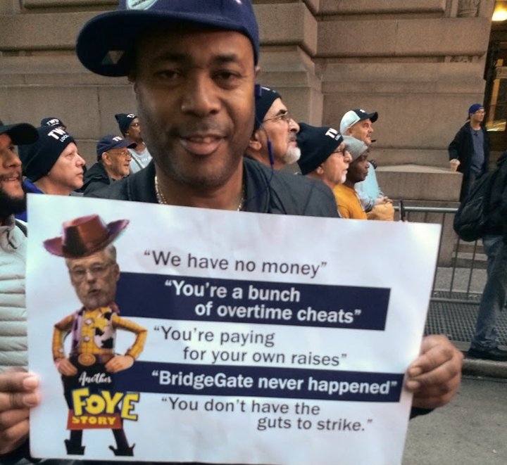 New York, Oct. 30 — Ten thousand transit workers jammed Manhattan’s lower tip tonight to say “No!” to the Mass Transit Administration’s giveback demands. MTA chairman Pat Foye — also known as “Pat Fraud” — is demanding workers pay much more money for health insurance.