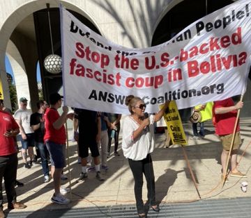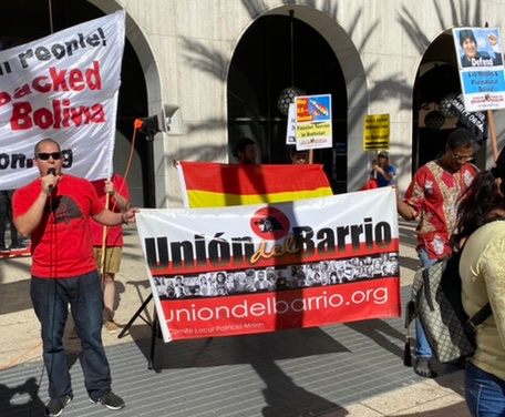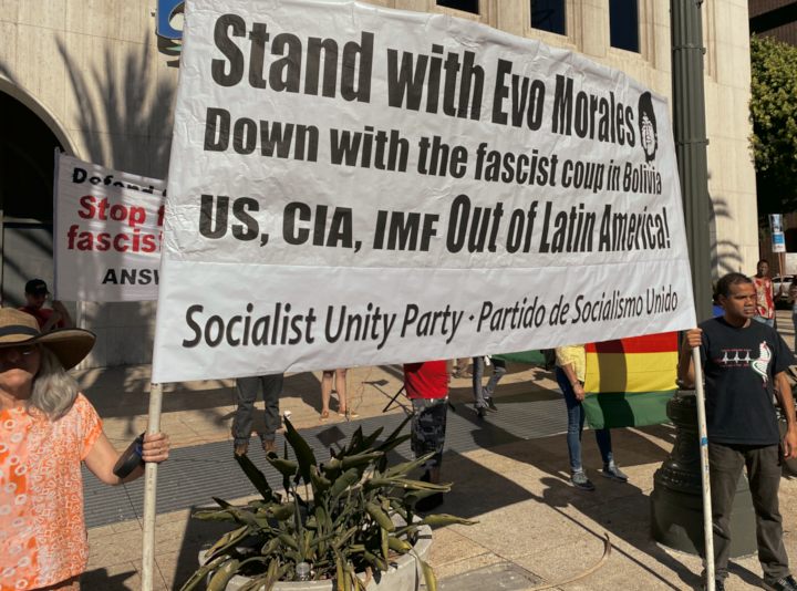 Demonstrators gathered in front of the Bolivian Consulate in Los Angeles on Nov. 16 to denounce the U.S.-backed coup and repression in Bolivia. Signs and banners expressed solidarity with the democratically elected president of Bolivia, Evo Morales.