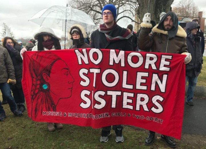 A striking red banner proclaimed “No more stolen sisters,” addressing the epidemic of missing and murdered Indigenous women, girls and two-spirit people (MMIWG2S) in the U.S. and Canada.