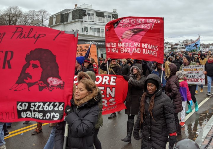 Led by a massive banner proclaiming “National Day of Mourning,” the crowd marched from Cole’s Hill through the main tourist area of Plymouth, before converging on the waterfront at the Plymouth Rock monument — another myth that everyone knows, but that has no connection to historical reality since the Pilgrims didn’t land there.
