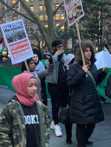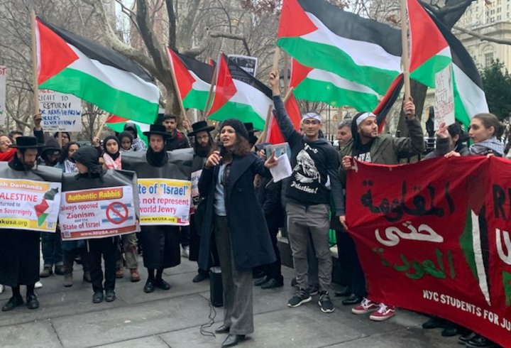Among the protesters was a large contingent of religious anti-Zionist Jews from Neturei Karta International-Jews United Against Zionism. A bus brought members of New Jersey’s large Palestinian community to the protest. Organizers included American Muslims for Palestine, Al-Awda NY: Palestine Right to Return Coalition, the New York for Palestine Coalition, the Palestinian American Community Center NJ, the Samidoun Palestinian Prisoner Solidarity Network, Students for Justice in Palestine at John Jay College and Within Our Lifetime-United for Palestine.