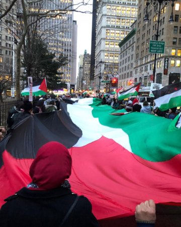 A Palestinian flag as long as a city block was carried outside New York’s City Hall on Jan. 31 as hundreds rallied to protest “the deal of the century” that Trump and Netanyahu seek to impose on the dispossessed Palestinian people.