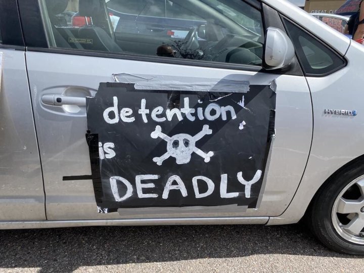 Signs on cars demanded “Free them all” and “Confront La Migra where they live.”