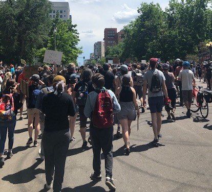 At the State Capitol, several thousand people laid on the ground for nine minutes, echoing the time during which police choked George Floyd. At the nearby amphitheater in Civic Center Park, speeches by several Black community leaders demanded a stop to the racist police killings of people of color.