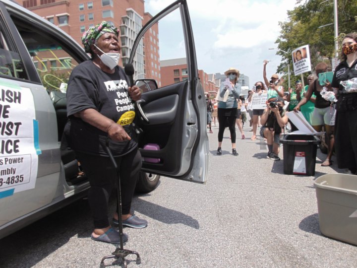 From the jail complex, the march traveled east to the Douglas Homes public housing development. The Rev. Annie Chambers, a PPA organizer and former Black Panther, has been holding free food giveaways to the residents there since the beginning of the pandemic. Demonstrators wanted to show solidarity with the residents of Douglas Homes, who find their homes a target for sale to and redevelopment by wealthy Johns Hopkins University.