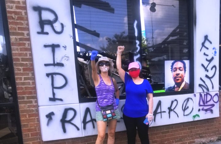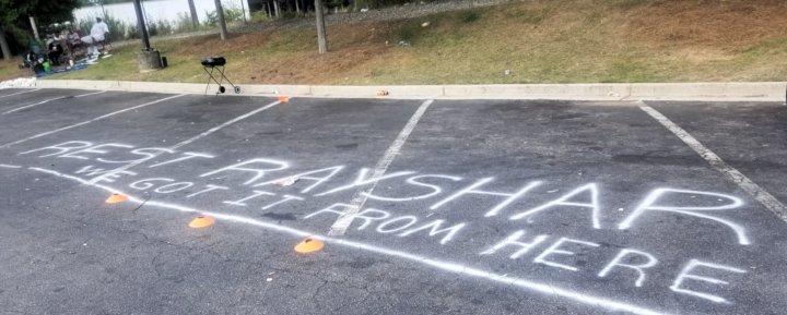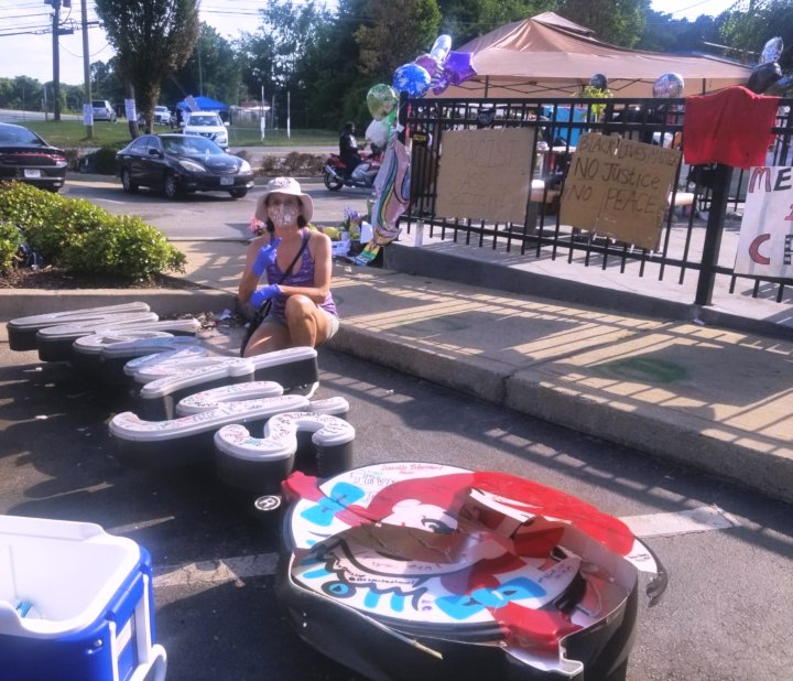 June 20 — There were people barbecuing, chanting and signing their name on a canvas at this sacred site on this beautiful sunny day at the Wendy’s where Rayshard Brooks was killed by Atlanta Police Department cops.