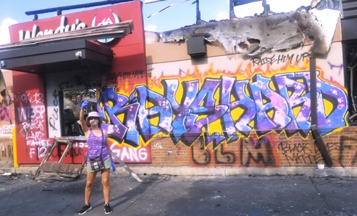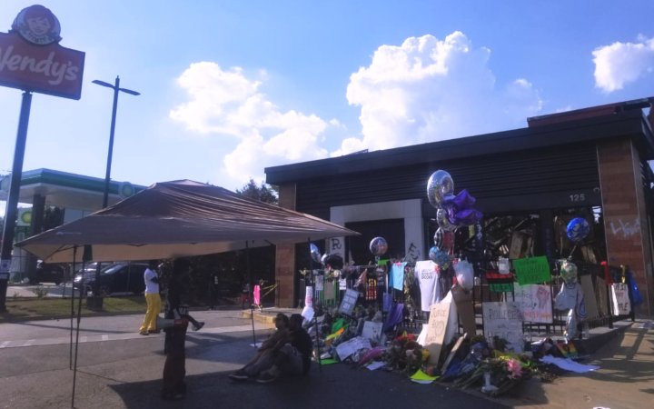 It was declared a cop-free zone by protesters last week, when they burned the Wendy’s to the ground in response to the brutal killing. The atmosphere was solemn as we walked toward the memorial that had been erected for Rayshard Brooks by his community.