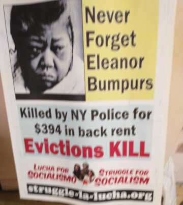 This writer carried a sign from Struggle-La Lucha that said, “Never Forget Eleanor Bumpurs.” The 66-year-old Black grandmother was killed on Oct. 29, 1984, as police enforced an eviction from her Bronx apartment. New York policeman Stephen Sullivan fired two blasts from his 12-gauge shotgun at her.