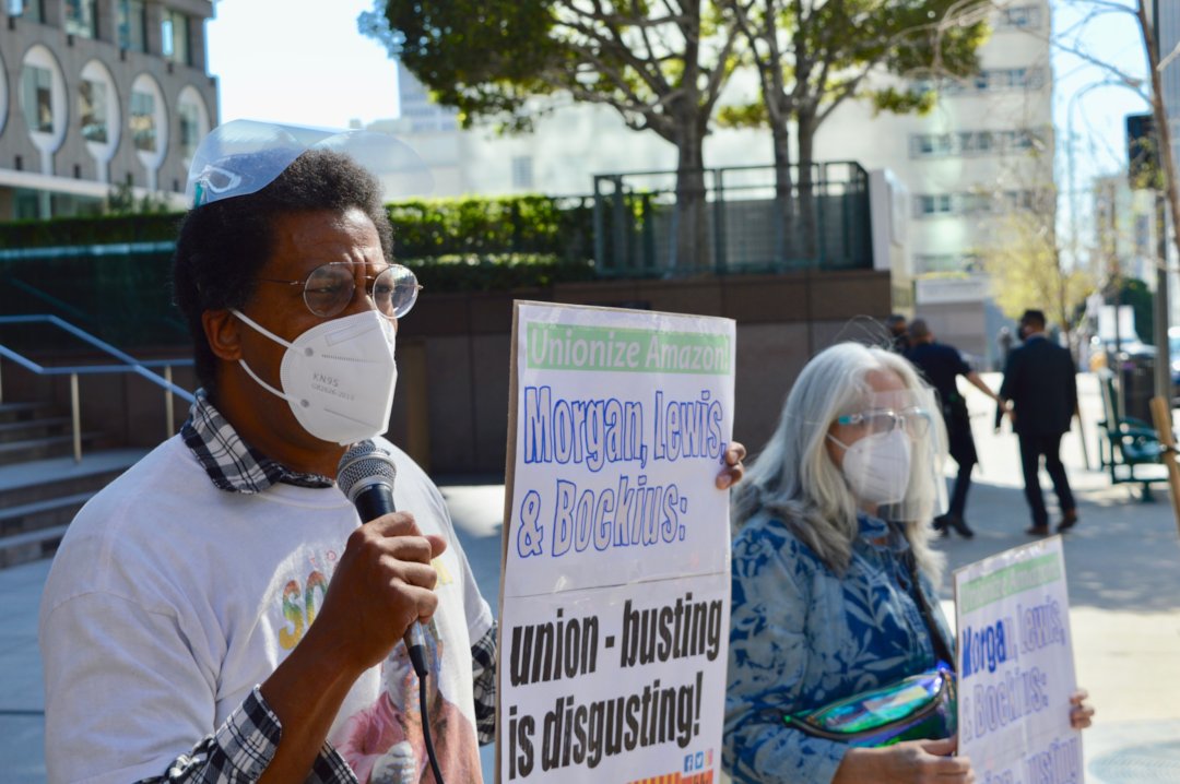 Jackson spoke at a Feb. 19 rally outside the Los Angeles office of Amazon’s union-busting law firm, Morgan, Lewis & Bockius.