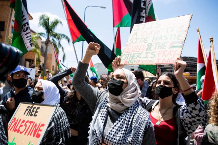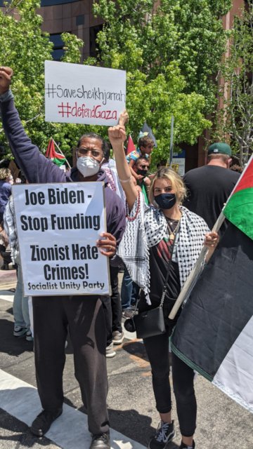 About 300 people gathered at the Israeli Consulate in Los Angeles May 11 to protest the genocidal war against Palestinian worshipers and homeowners soon to be evicted by racist, violent Zionist occupiers in areas of Jerusalem.