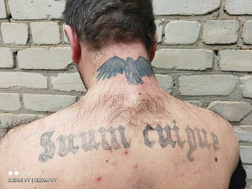 During this offensive, DPR forces captured many Aidar Battalion soldiers. Armenian and Ukrainian independent media were able to take pictures of one soldier. On his neck and back, he had an iron eagle tattoo and the Latin term “Suum Cuique.” That term translated into German is, “Jedem Das Seine.” It roughly means, “To each what he deserves.”