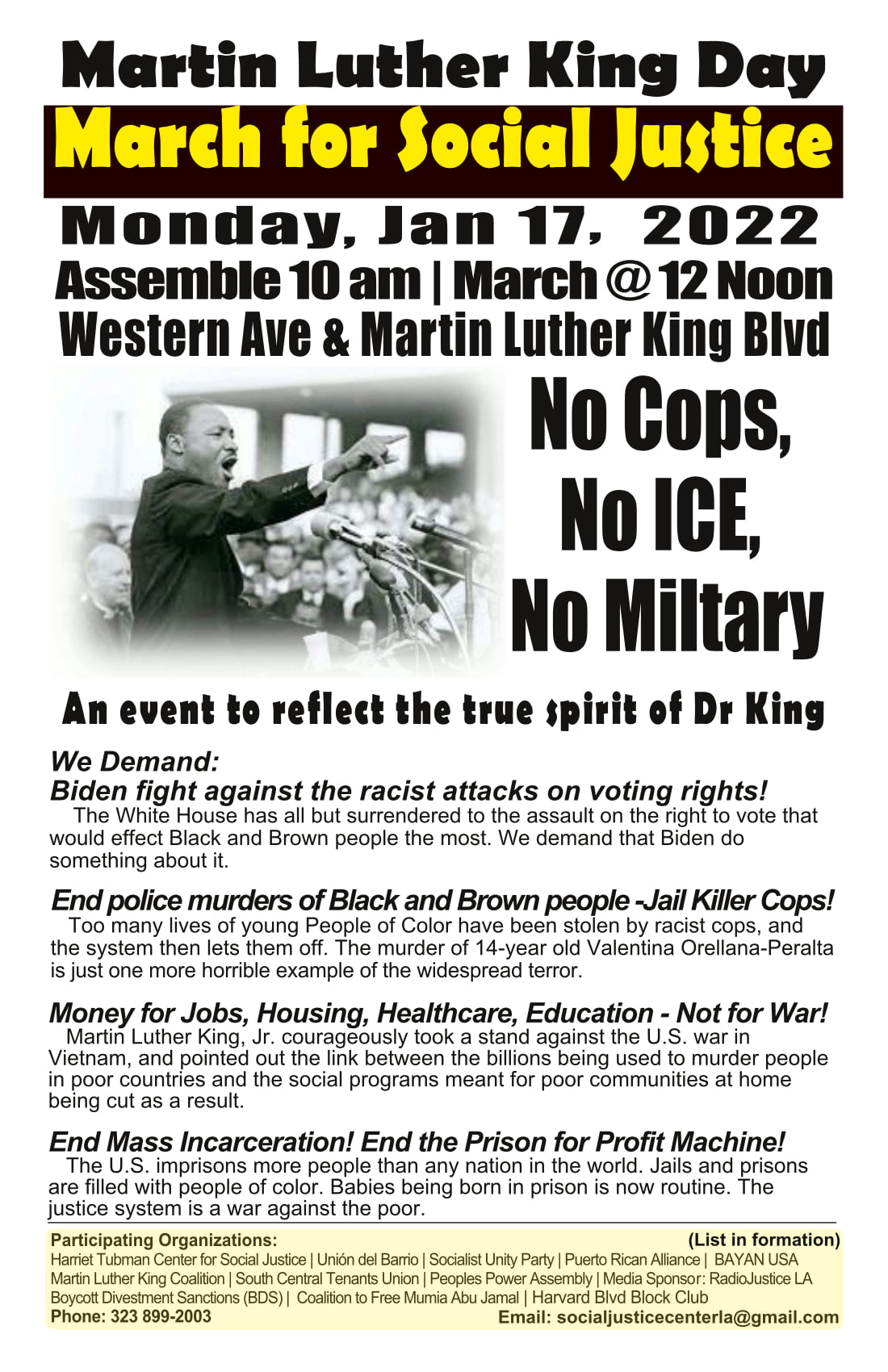 Many in South Central, where the MLK Parade occurs, see the recent killing of 14-year-old Valentina Orellana-Peralta, a recent immigrant from Chile, as yet another horrible reminder of the terror created by the police forces against the predominantly Black and Brown community. Her tragic death was caused by a stray bullet from a Los Angeles Police Department military assault weapon fired in a crowded store.