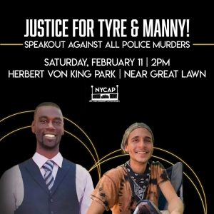 JUSTICE FOR TYRE, MANNY, AND ALL PEOPLE MURDERED BY THE COPS! Join NYCAP as we speak out against these horrific murders at the hands of the police. In 2022, over 1000 people were murdered by the police. Additionally, the NYPD continues to get a bigger and bigger budget while communities are left without resources!