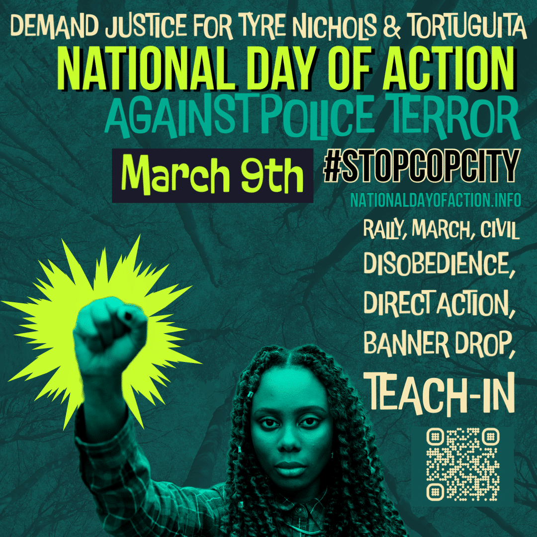 Calling all organizations, organizers, students and community members to join the call for a National Day of Action on March 9th to demand justice for the police murder of Tyrie Nichols in Memphis, #stopcopcity Forest Defender Tortuguita, and all others lost and impacted by police violence and terror.