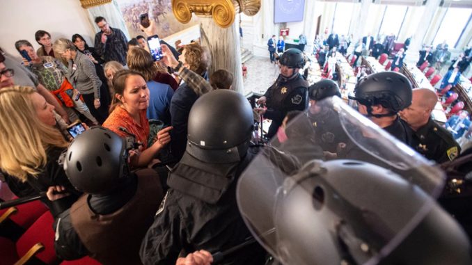 Days later, on April 24, when protesters responded by chanting “Let her speak!” from the gallery, Zephyr symbolically raised her silent microphone. Montana State Troopers in riot gear marched onto the floor of the legislature in front of Zephyr, then arrested seven people in the gallery. The Republican majority canceled the next day’s session.