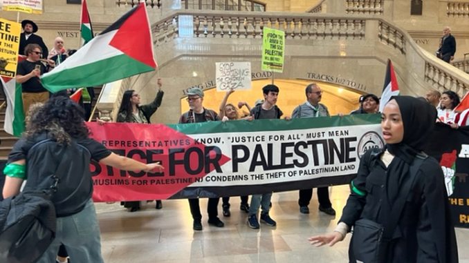 The rally was called by NY4Palestine, which includes Al-Awda NY, the Palestine Right to Return Coalition; American Muslims for Palestine; Palestinian Youth Movement; and Students for Justice in Palestine.
