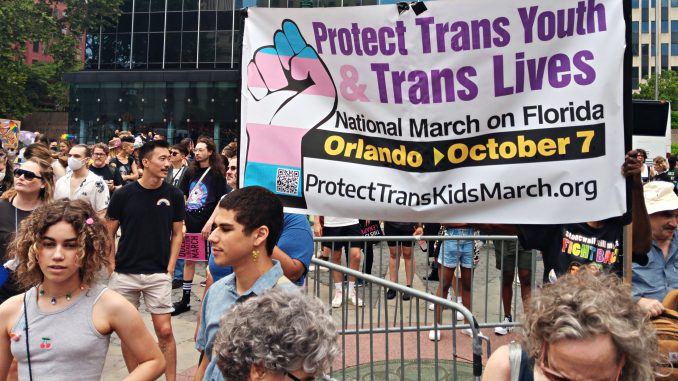 Activists from Women in Struggle-Mujeres en Lucha held a banner and gave out hundreds of leaflets for the Oct. 7 National March to Protect Trans Youth and Speakout for Trans Lives in Orlando, Florida. Socialist Unity Party members also distributed hundreds of Struggle-La Lucha newspapers with the headline, “March on Florida: Resist the ban on trans lives.”