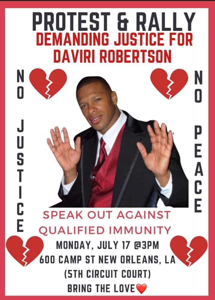 For the last four years, the Robertson family has been fighting for justice. Join them in solidarity on Monday, July 17, at 3 PM, at the 5th Circuit Court in New Orleans at 600 Camp St. to protest qualified immunity and to demand that killer cops be held to account for their crimes.