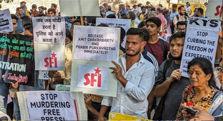 Several journalist bodies, students’, youth and civil society organisations held protests at Press Club of India and Jantar Mantar on October 4th against recent witch hunt of employees of #NewsClick, and especially the arrest of #PrabirPurkayastha and #AmitChakravarty pic.twitter.com/Qjtd7OHzwt