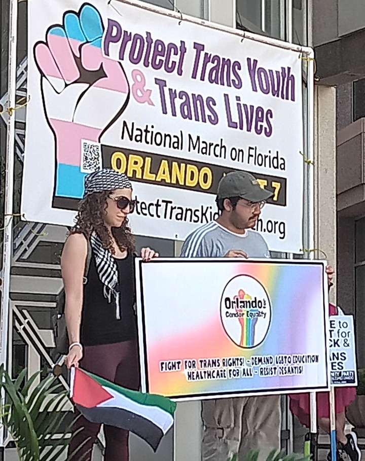 Other speakers included: Andrea Montanez, an immigrant trans woman from Colombia; Gina Davila and Laura Rodriguez of the Tampa 5, student protesters facing felony charges; youth organizer Zander Moriczon; Tatiana Quiroga, executive director of Come Out With Pride Orlando; Simon Rowe, a young trans member of Teamsters Local 79 in Tampa; and Jamila Nicole, Orlando for Gender Equality.