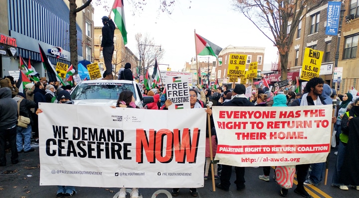 Many protests have been organized by Shut It Down for Palestine, which includes the Palestinian Youth Movement, Al-Awda NY, the Palestine Right to Return Coalition, National Students for Justice in Palestine, The Peoples Forum, ANSWER Coalition, and the Party for Socialism and Liberation.
