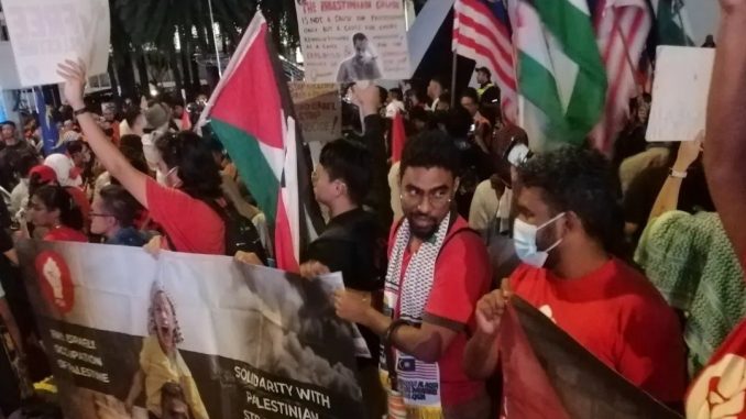 The Kepung Demi Palestin or the “Siege for Palestine” demonstration is organized by the Palestine Solidarity Secretariat (SSP), a coalition of 48 groups, including political parties from both the ruling and opposition coalitions, civil society groups, and youth and student movements.