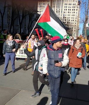 Among the groups that organized the protest were the Palestinian Youth Movement; Al Awda NY/NJ, The Palestine Right to Return Coalition; Students for Justice in Palestine; The People’s Forum; ANSWER Coalition; Party for Socialism and Liberation; and Neturei Karta, Jews Against Zionism.