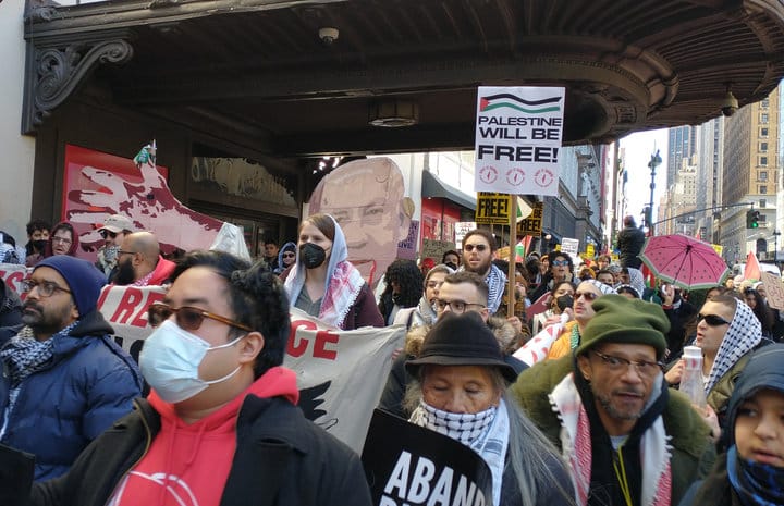 People then marched north on Eighth Avenue, stopping briefly at the New York Times, which has been lying about Palestine for 75 years. The march ended at the Lincoln Center for the Performing Arts.