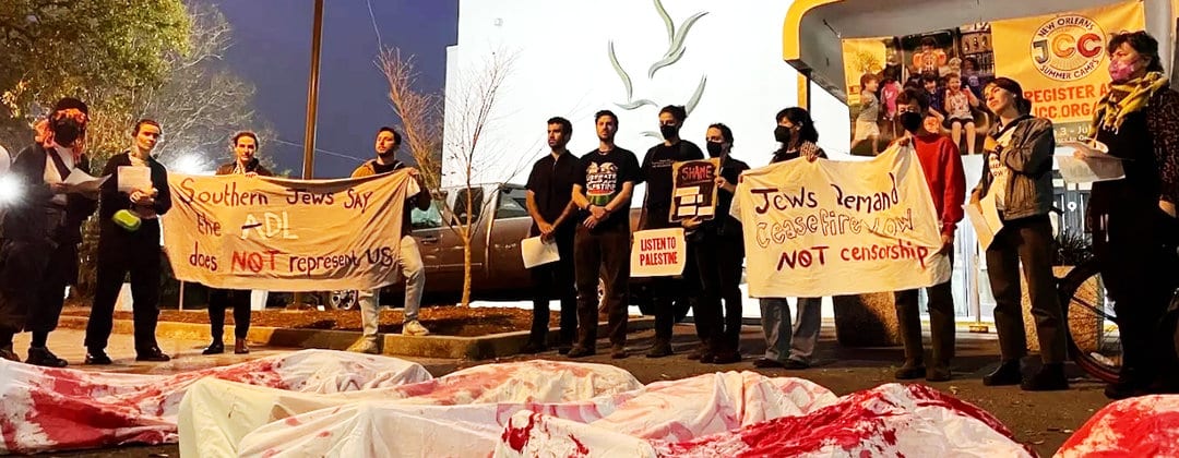 New Orleans, Feb. 28 – Dozens of Jewish activists led by Jewish Voice for Peace NOLA gathered outside the Jewish Community Center to stage a die-in and to protest a board meeting of the Anti-Defamation League happening inside.