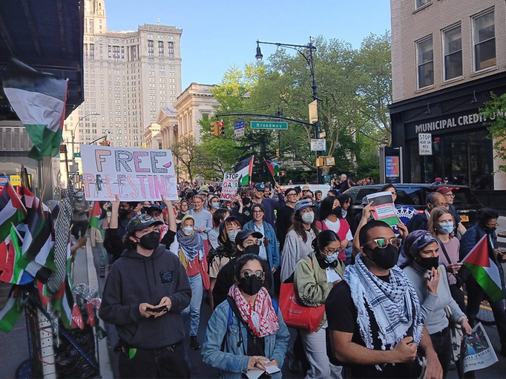 People marched to Washington Square near where New York University students had their encampment attacked by police with many students arrested. One section of the demonstration continued to march and rallied at a NYU building complex. Other groups marched to the New School and Fordham University.