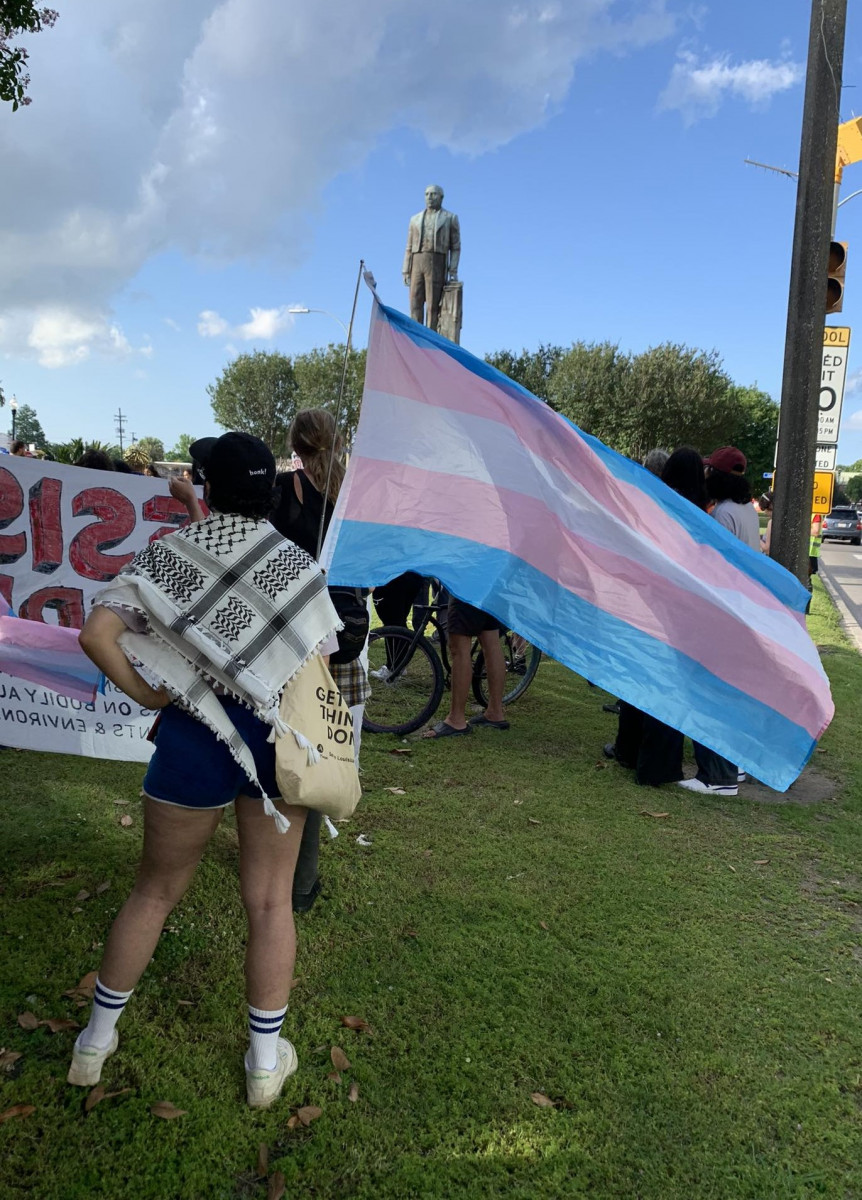 QTCAP activists held aloft a banner saying, “Resist Landry.” Jeff Landry is Louisiana’s far-right, bigoted governor, who recently tried to prevent hungry kids from accessing school lunch over the summer (doesn’t seem like much of a “family man”). Others in the crowd held up the blue, pink and white trans pride flag.