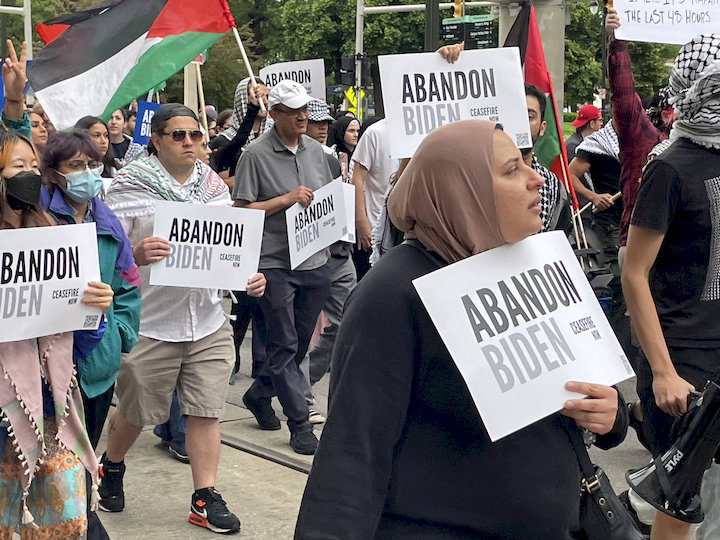 Passers-by and drivers stalled as the march passed through intersections and waved support for the marchers’ drums, chants, large Palestinian flags, and the many “Abandon Biden” signs.