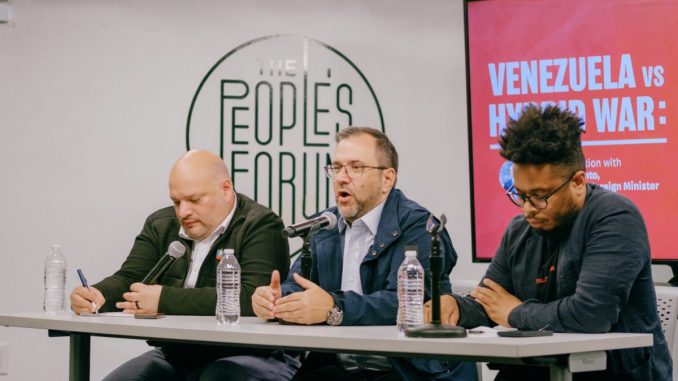 El 13 de junio, Yván Gil Pinto, ministro de Asuntos Exteriores de Venezuela, habló ante una multitudinaria recepción en el Foro del Pueblo de Nueva York. Manolo de los Santos, director ejecutivo del Foro del Pueblo, dio la bienvenida a Pinto y ayudó a enmarcar la conversación con preguntas capciosas.