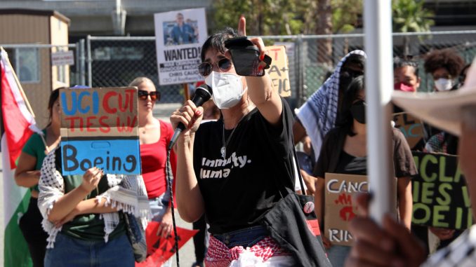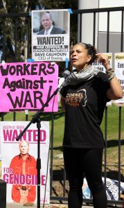 When the rally at the site of the weapons makers concluded, the crowd took over all four lanes of East Imperial Highway and marched a mile east to the Los Angeles Times building. Among the speakers was Fatin from the Unmute Humanity organization. Judeh blasted the Times for its pro-Zionist reporting and history of completely ignoring the brilliant and widespread protest movement that has taken to the streets over and over again since the Zionist genocide against the people of Gaza began. Soon after the Zionist state launched its bloody assault, the Times banned 38 of its own reporters from covering Gaza after they signed an open letter criticizing the paper for its pro-Israel bias.