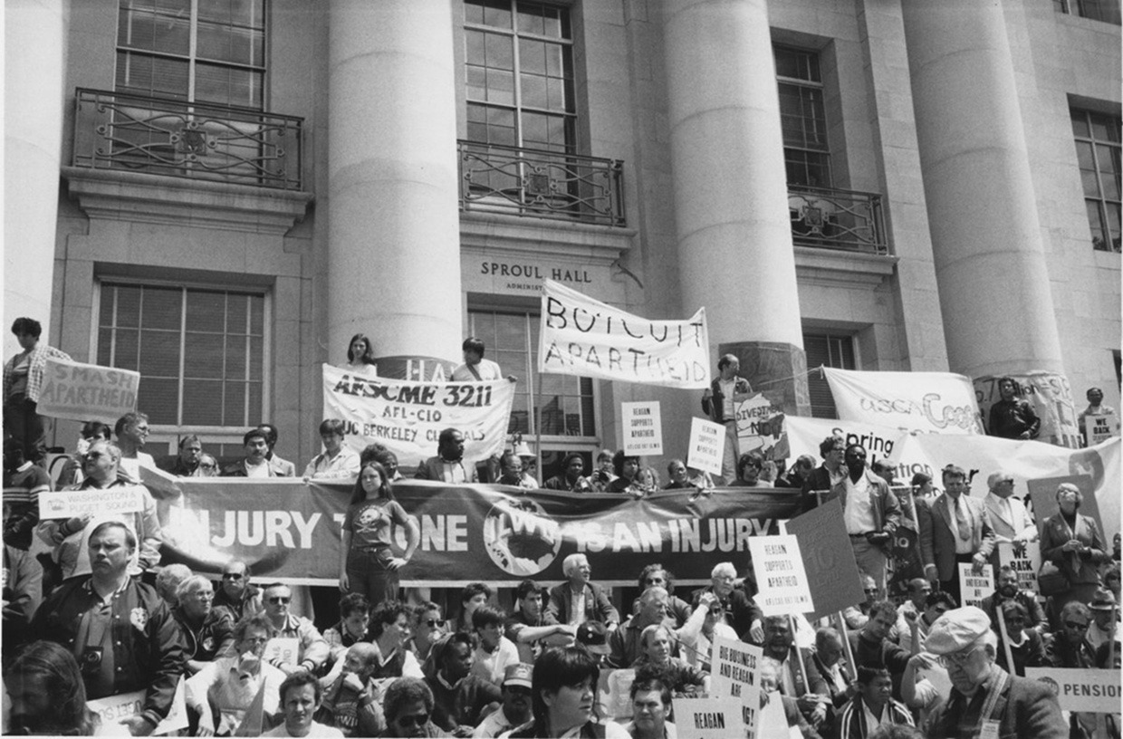 The dockworkers’ boycott helped inspire students at UC Berkeley to expand their protests in 1985, the largest activism there since the Vietnam War. Thousands rallied, and hundreds erected shantytowns resembling South African townships, leading to repeated clashes with police and heightened public awareness. Wright and Keylor spoke at rallies with a large ILWU banner displaying “an injury to one is an injury to all.” The protests ultimately forced a very reluctant Board of Regents to divest relevant portions of its $3 billion endowment.