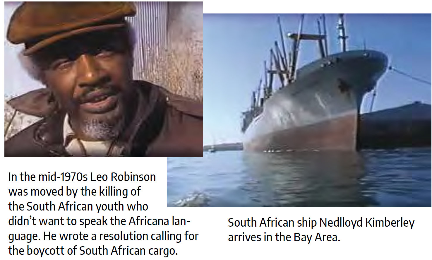 Brother Leo Robinson, an African American and communist who regularly critiqued capitalism, imperialism, and racism, became interested in South Africa during the Soweto uprising. He wrote a resolution to establish SALSC and boycott South African cargo, which Local 10’s Executive Board passed.