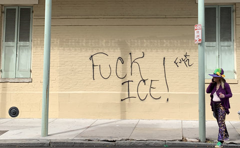New Orleans, Feb.18 – “F*** ICE” might as well have been an unofficial motto of Mardi Gras 2026 — graffitied around the city (along with “ABOLISH ICE”), printed on signs, and even stitched into the costumes of carnival-goers. Some parading groups or krewes, like Krewe du Vieux, integrated anti-ICE messaging into their floats and walking contingents.