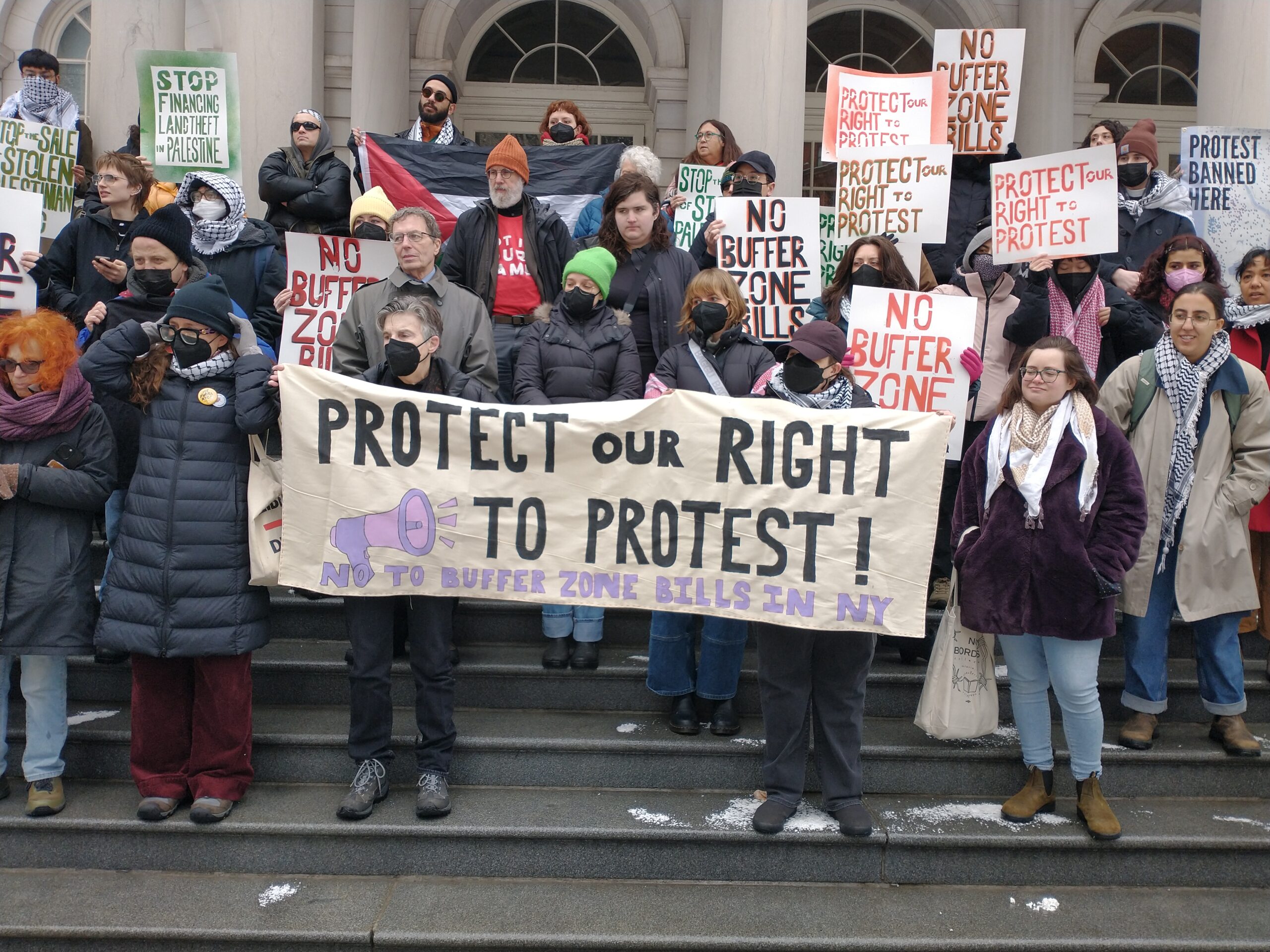 Feb. 25 — The front steps of New York City’s City Hall were filled with people this morning protesting attempts to muzzle protests against the theft of Palestinian land.