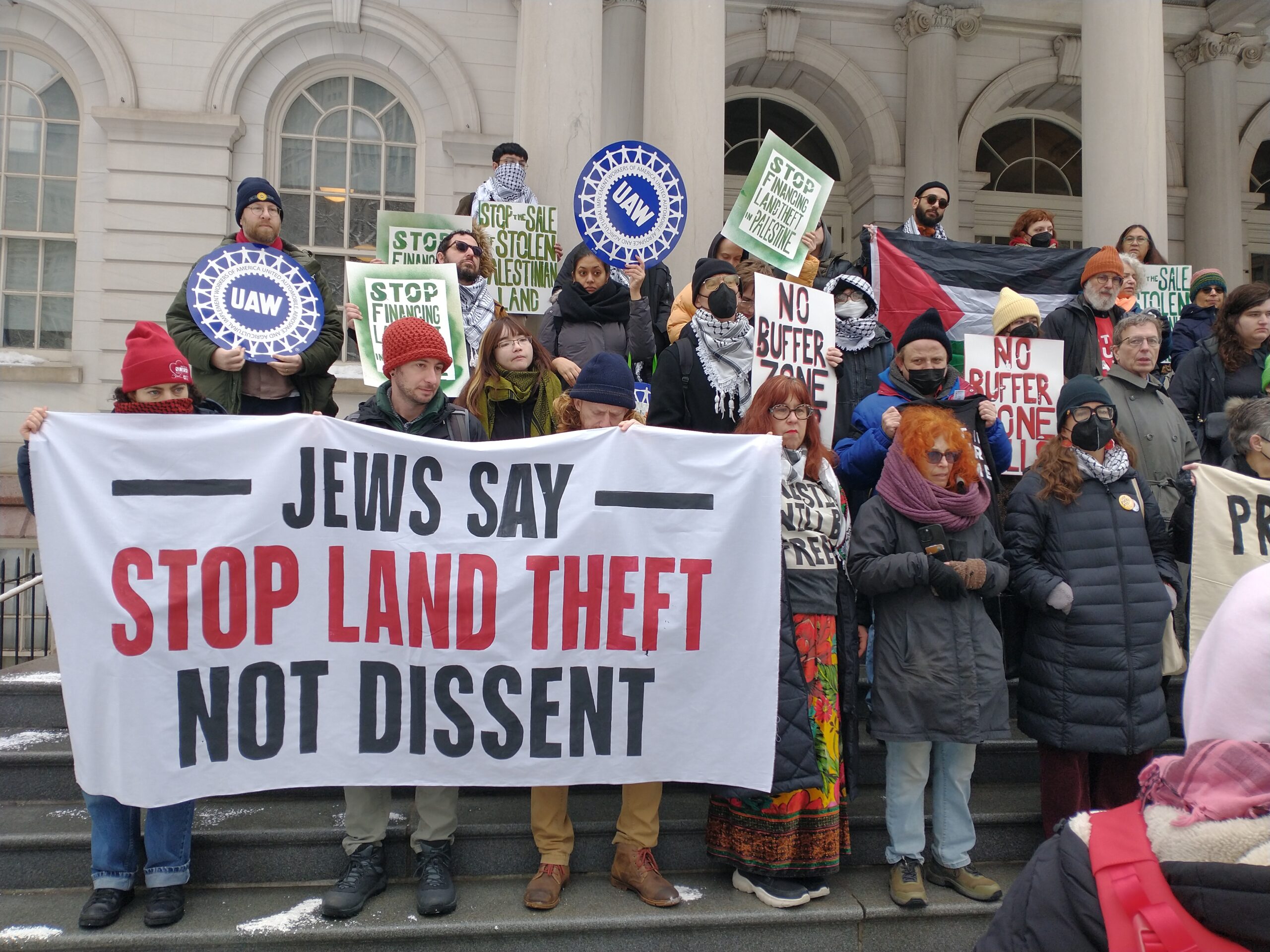 The protest was called by a diverse coalition of groups, including PAL-Awda NY/NJ, which has organized protests against the sale of stolen Palestinian land in New York City. Other groups included UAW locals 2710 (Columbia grad student workers) and 2325 (legal aid attorneys), Jews for Racial and Economic Justice, Jews Against White Supremacy (JAWS), the National Lawyers Guild, CUNY for Palestine, Trans formative schools and New York for Abortion Rights.