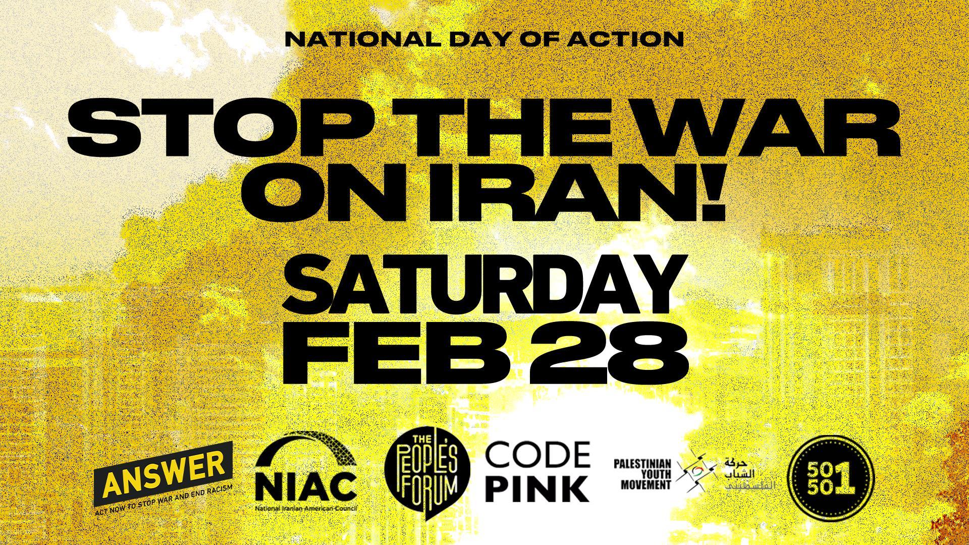Initial sponsoring organizations of the day of protest include: ANSWER Coalition, National Iranian American Council, 50501, American Muslims for Palestine, The People’s Forum, Palestinian Youth Movement, and CODEPINK.